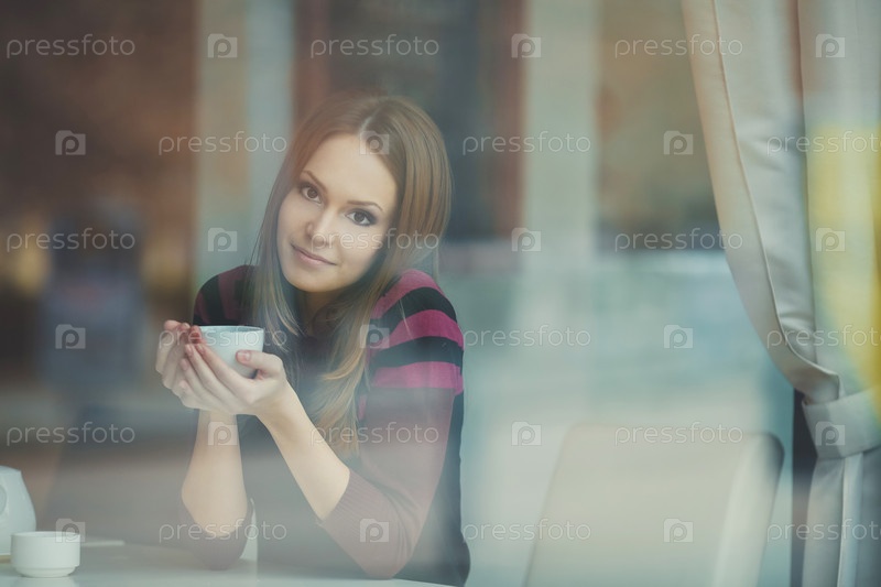Лучезарная девушка в кафе с чашкой чая смотрит через стекло