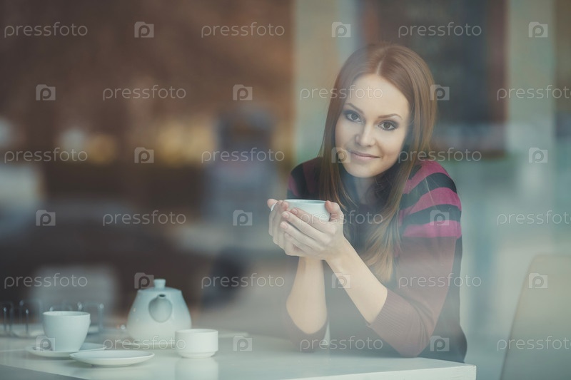Лучезарная девушка в кафе с чашкой чая смотрит через стекло