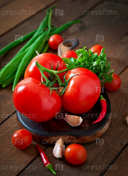 Филиал свежих помидоров на деревянных фоне