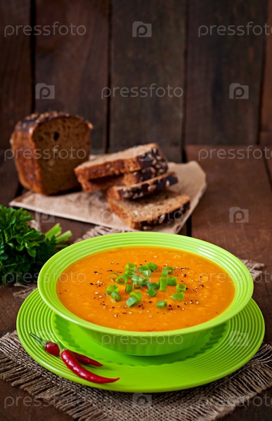 Вкусный крем суп из тыквы в зеленый шар на старый деревянный стол