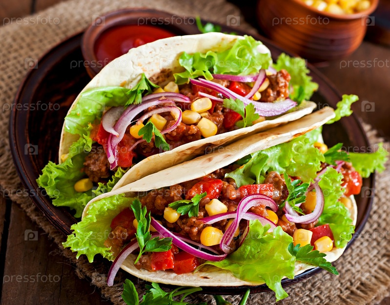 Мексиканские тако с мясом, овощами и красным луком
