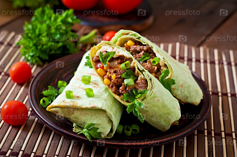 Буррито обертывания с рубленой говядиной и овощами на фоне деревянные