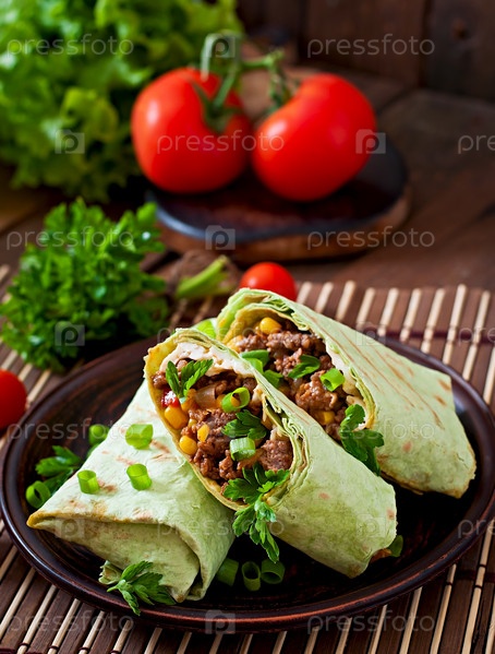 Буррито обертывания с рубленой говядиной и овощами на фоне деревянные