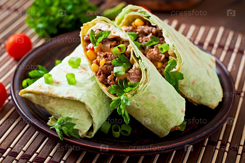 Буррито обертывания с рубленой говядиной и овощами на фоне деревянные
