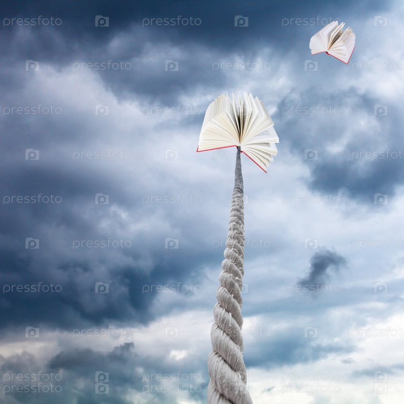 Книга на веревке парит в облаках
