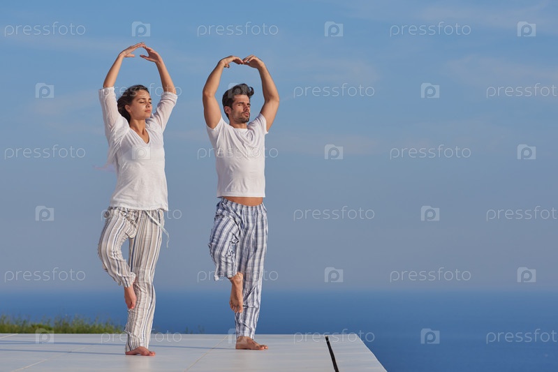Молодая пара занимается йогой