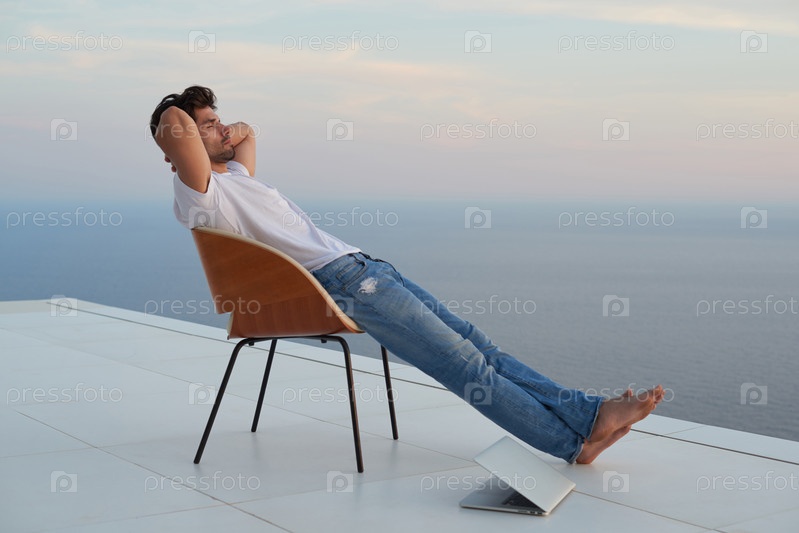 Мужчина с ноутбуком сидит на крыше