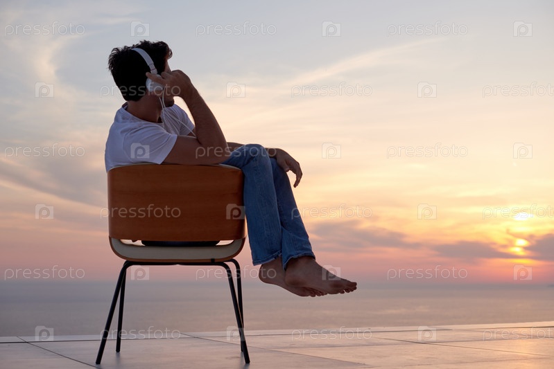 Мужчина слушает музыку на закате, сидя на балконе
