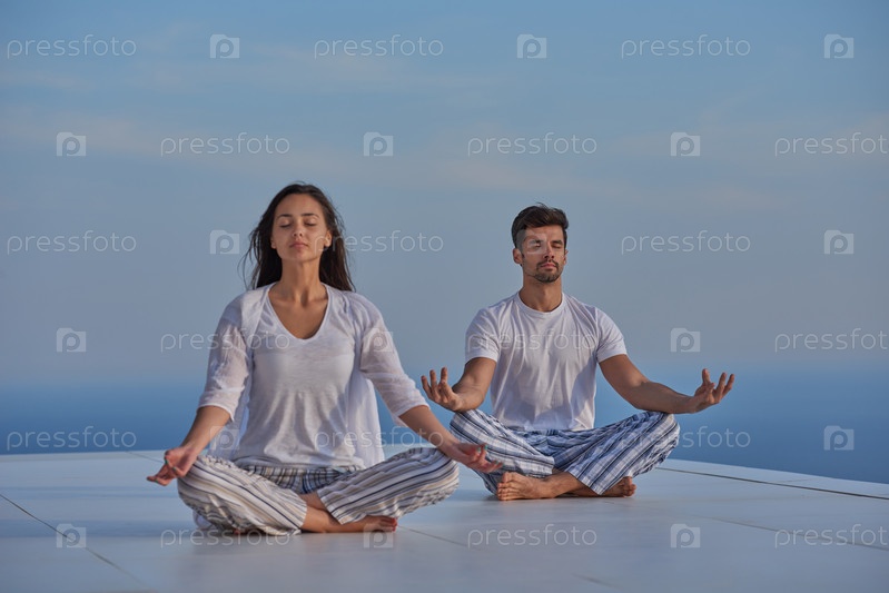 Молодая пара занимается йогой