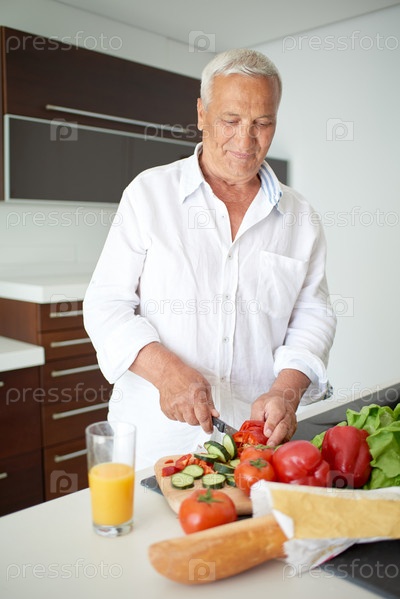 Мужчина готовит салат в кухне