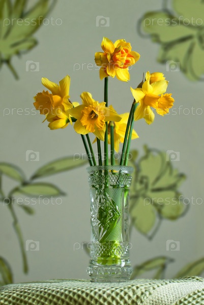 Букет желтых нарциссов в хрустальной вазе на светлом фоне