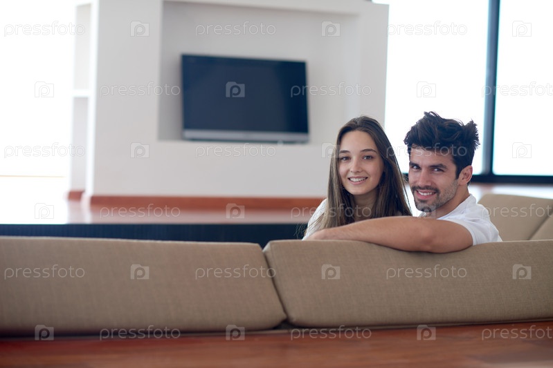 Расслабленной молодая пара на диване дома