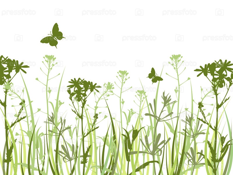 Зеленый фон с цветами и бабочками