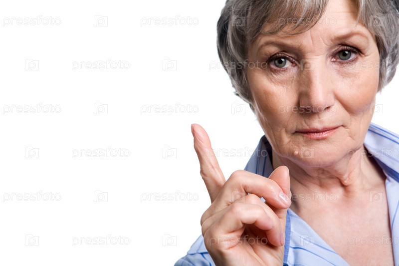 Фото пожилой женщины с указательным пальцем, указывающим вверх на белый фон