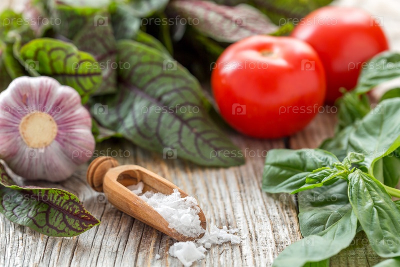 Соль, зелень, помидоры и чеснок