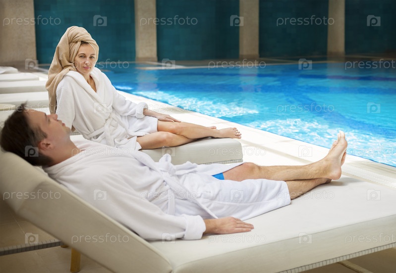 Пара в халатах отдыхает в спа у бассеина