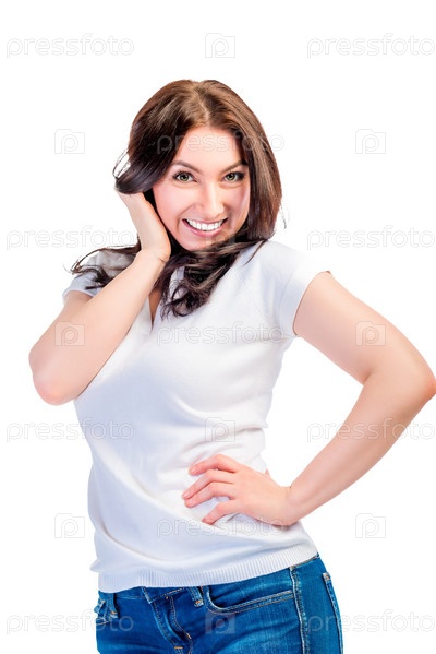 Довольно привлекательная брюнетка в белой футболке изолированные