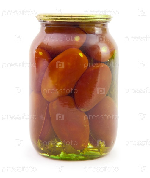 Маринованные помидоры внутри стеклянной банки изолированы на белом фоне