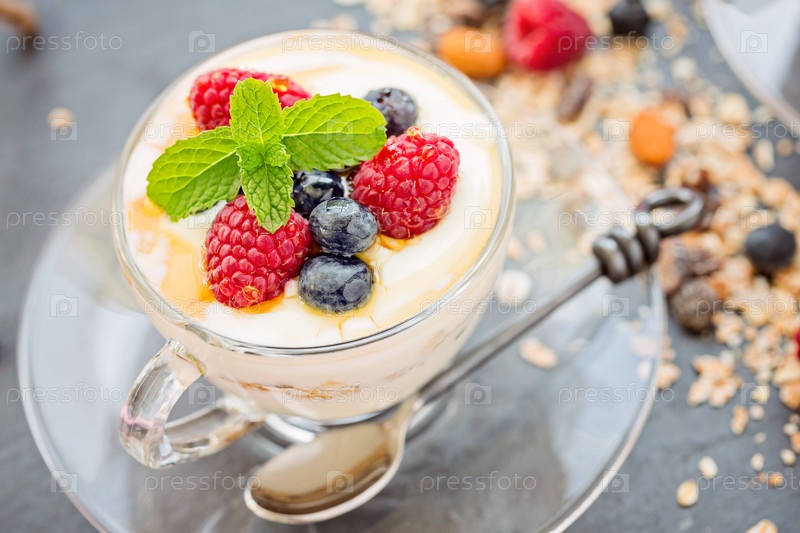 Чашка натурального йогурта, свежие ягоды и мюсли, хлопья, крупным планом, горизонтали композиция