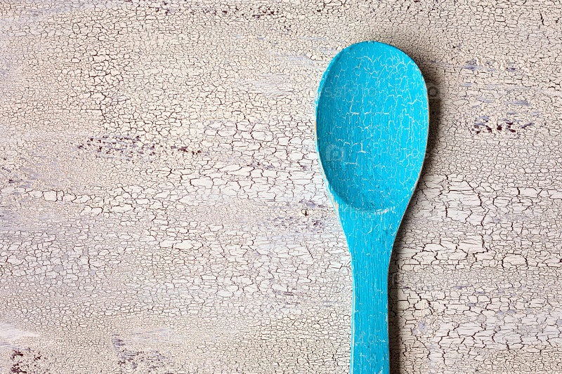 Синий деревянный ложечка на деревянных фоне, вид сверху