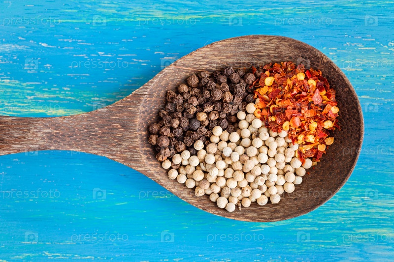 Деревянной ложкой с три типа черного, белого и перец Чили, на синем фоне деревянные, вид сверху