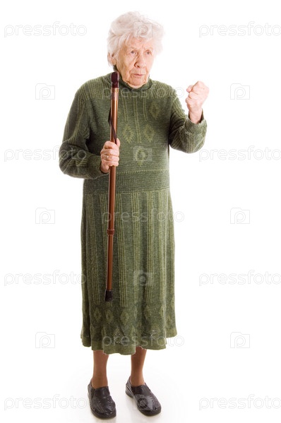 Пожилая сердитая женщина с тростью