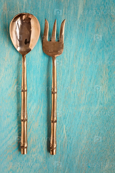 Порция латуни ложкой и вилкой на синем фоне деревянные, вид сверху, вертикальная композиция