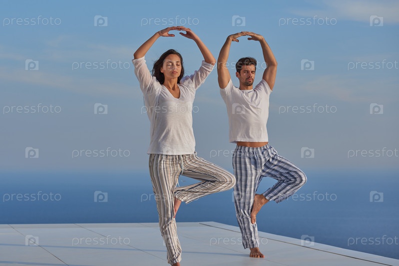 Молодая пара занимается йогой