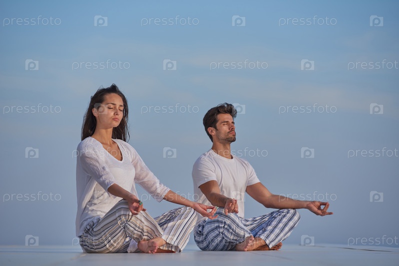 Молодая пара занимается йогой