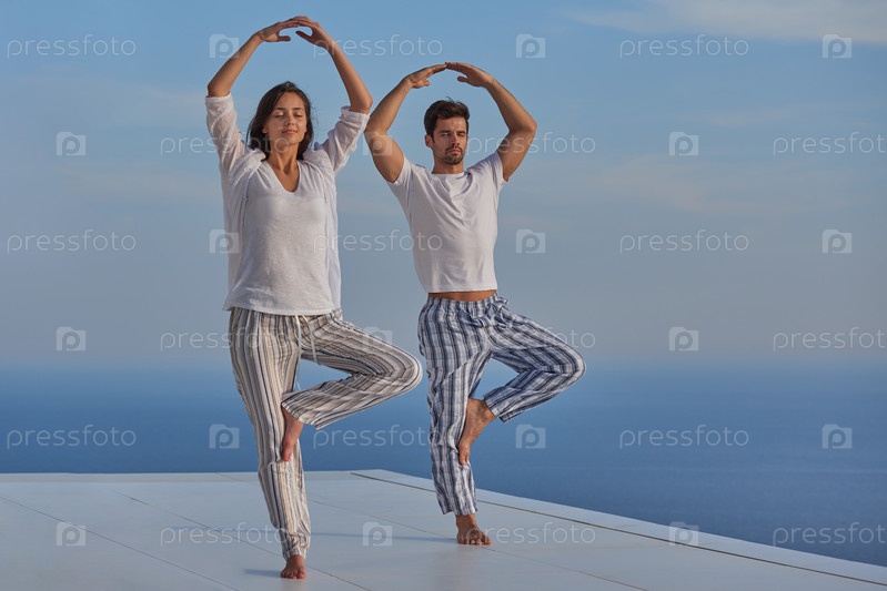 Молодая пара занимается йогой
