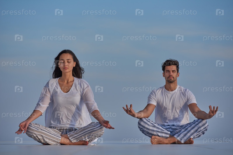 Молодая пара занимается йогой