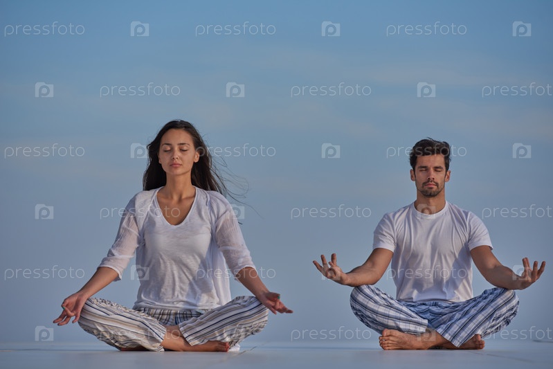 Молодая пара занимается йогой