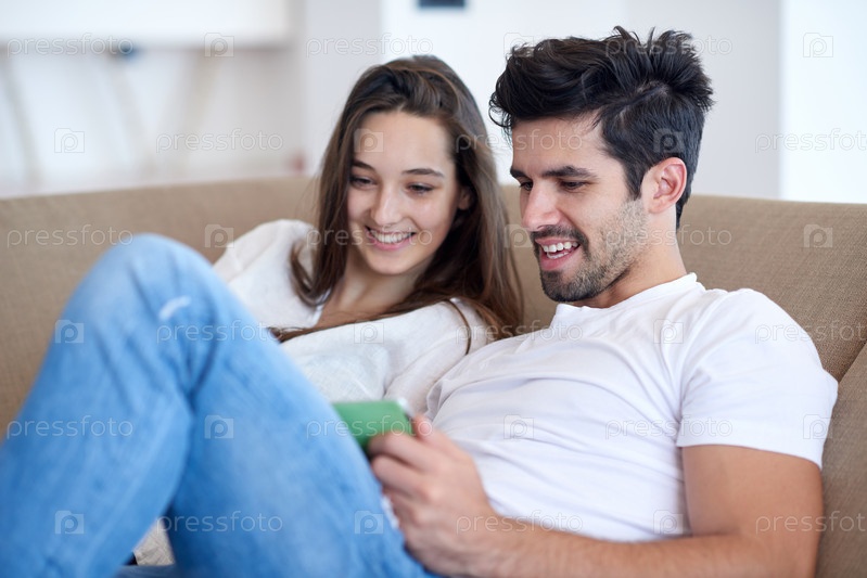 Пара с планшетом в современном доме