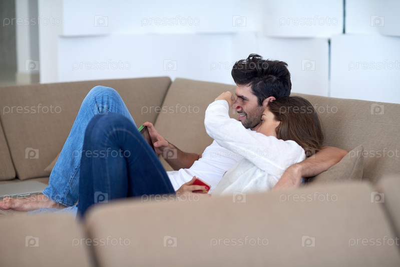 Пара с планшетом в современном доме