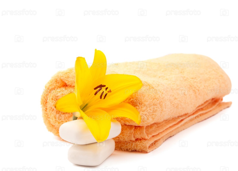 Лилия на полотенце и мыло на белом фоне