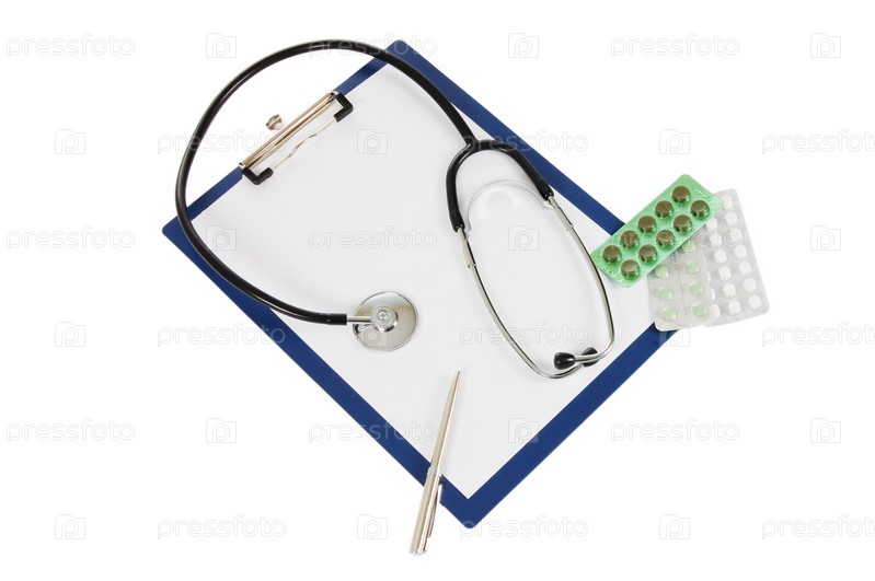 Фонендоскоп, таблетки и ручка на папке-планшете