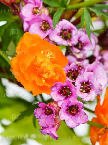 Купальница и бадан крупным планом