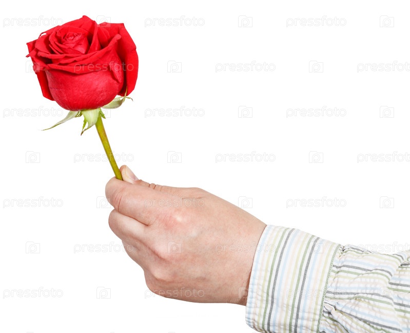 Мужская рука держит красный цветок розы изолированные