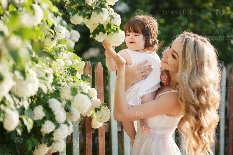 Блондинка в цветущем саду с девочкой на руках