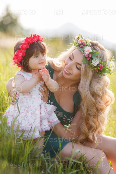 Блондинка в поле с маленькой дочкой