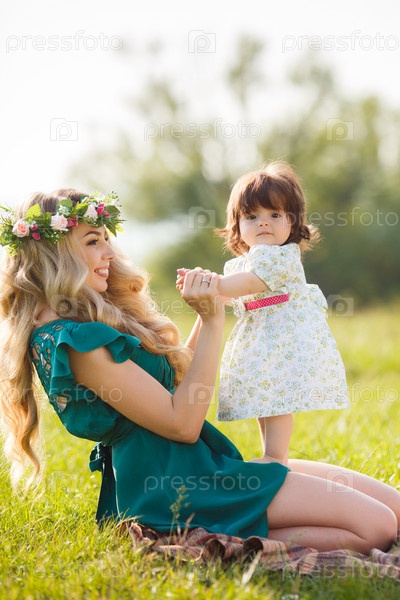 Блондинка в поле с маленькой дочкой