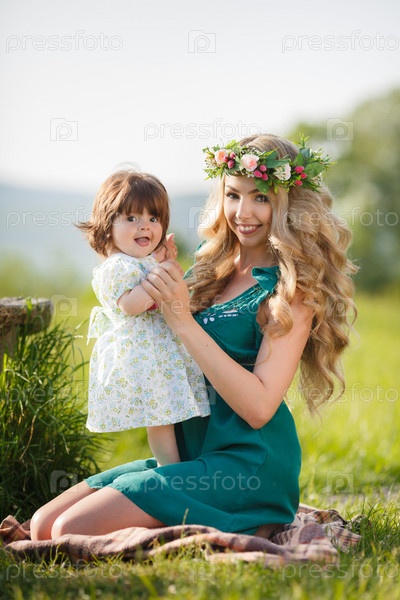 Блондинка в поле с маленькой дочкой