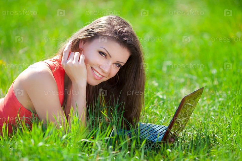 Девушка в ярком на поле с ноутбуком