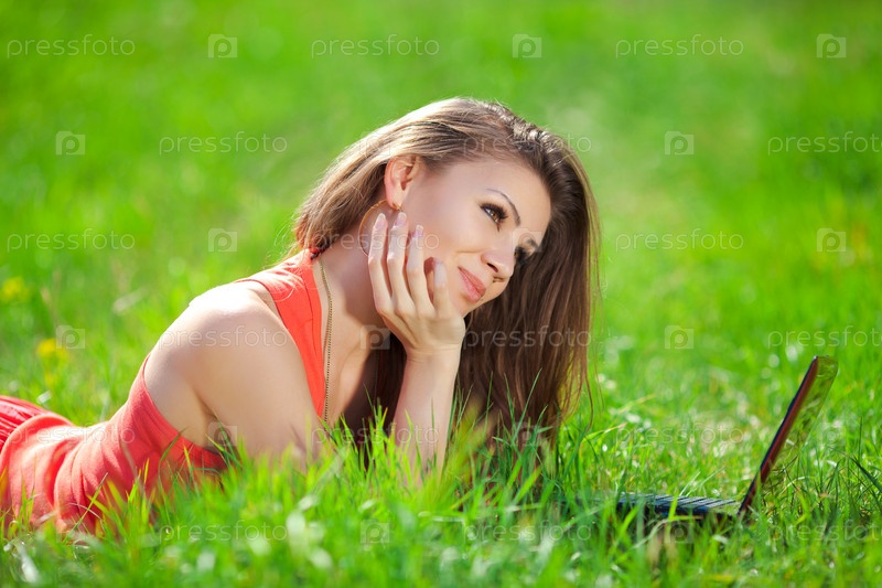 Девушка в ярком на поле с ноутбуком