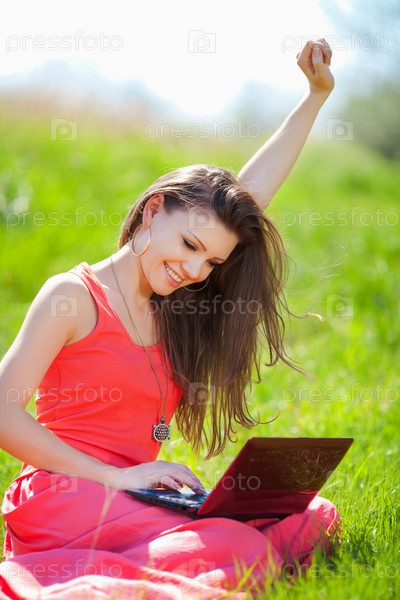 Девушка в ярком на поле с ноутбуком
