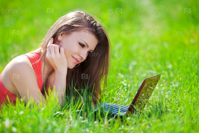 Девушка в ярком на поле с ноутбуком