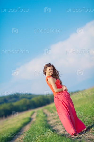 Девушка в ярком на поле