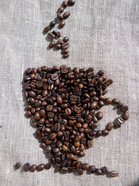 Чашка кофе, выложенная из кофейных зерен, на мешковине