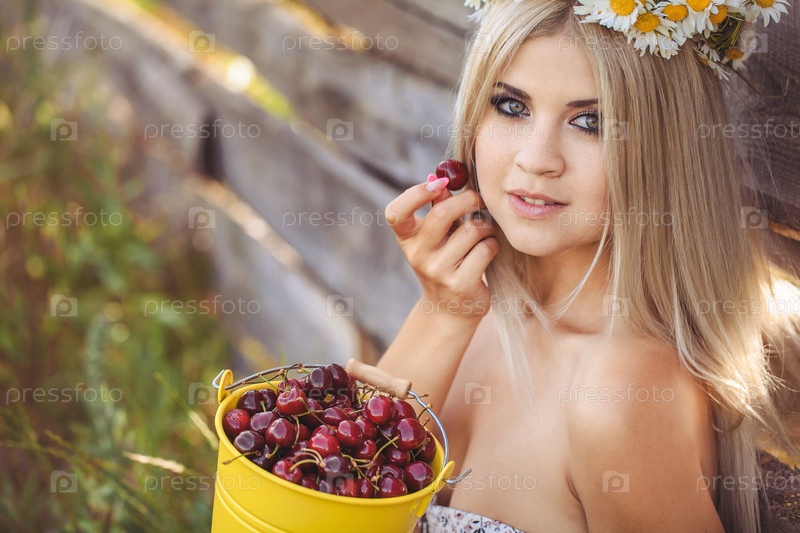 Девушка с вишней у деревянного забора