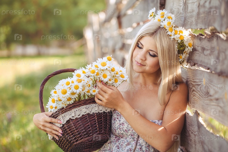 Девушка с ромашками у деревянного забора